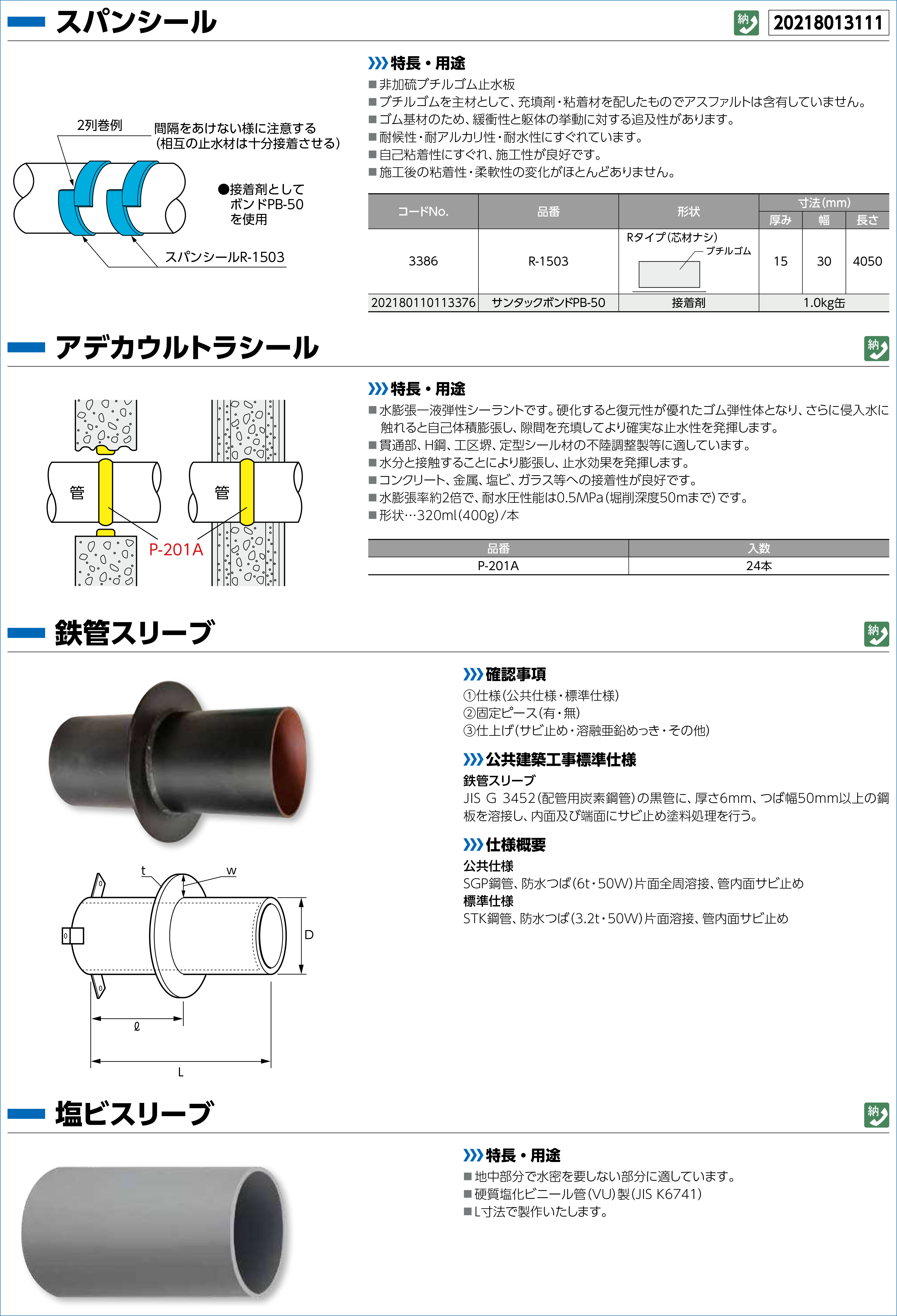 ● 鉄管スリーブ…つば付鉄管製(公共仕様 配管用炭素鋼鋼管/標準仕様 一般構造用炭素鋼鋼管)