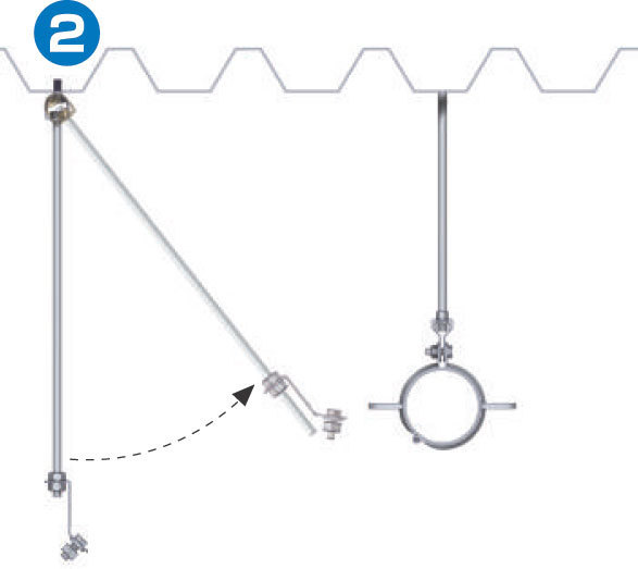 | エースハンガーを配管支持施工します。 | 天井スラブにスラブ固定金具を取り付け、吊りボルトと振れ止め金具を接続します。 | エースハンガーと振れ止め金具を接続し、5点(3点)を均等になるよう施工します。 |
