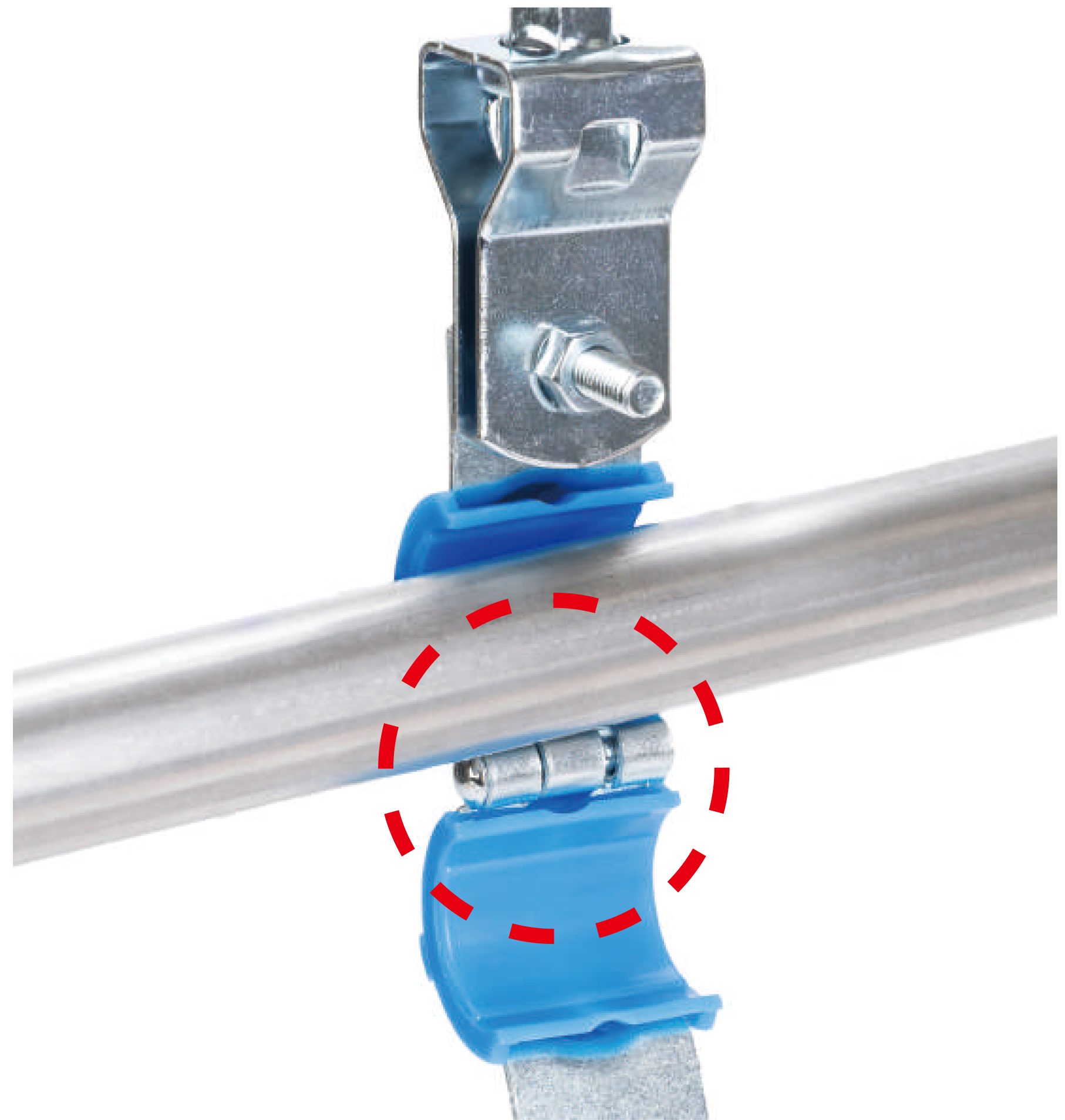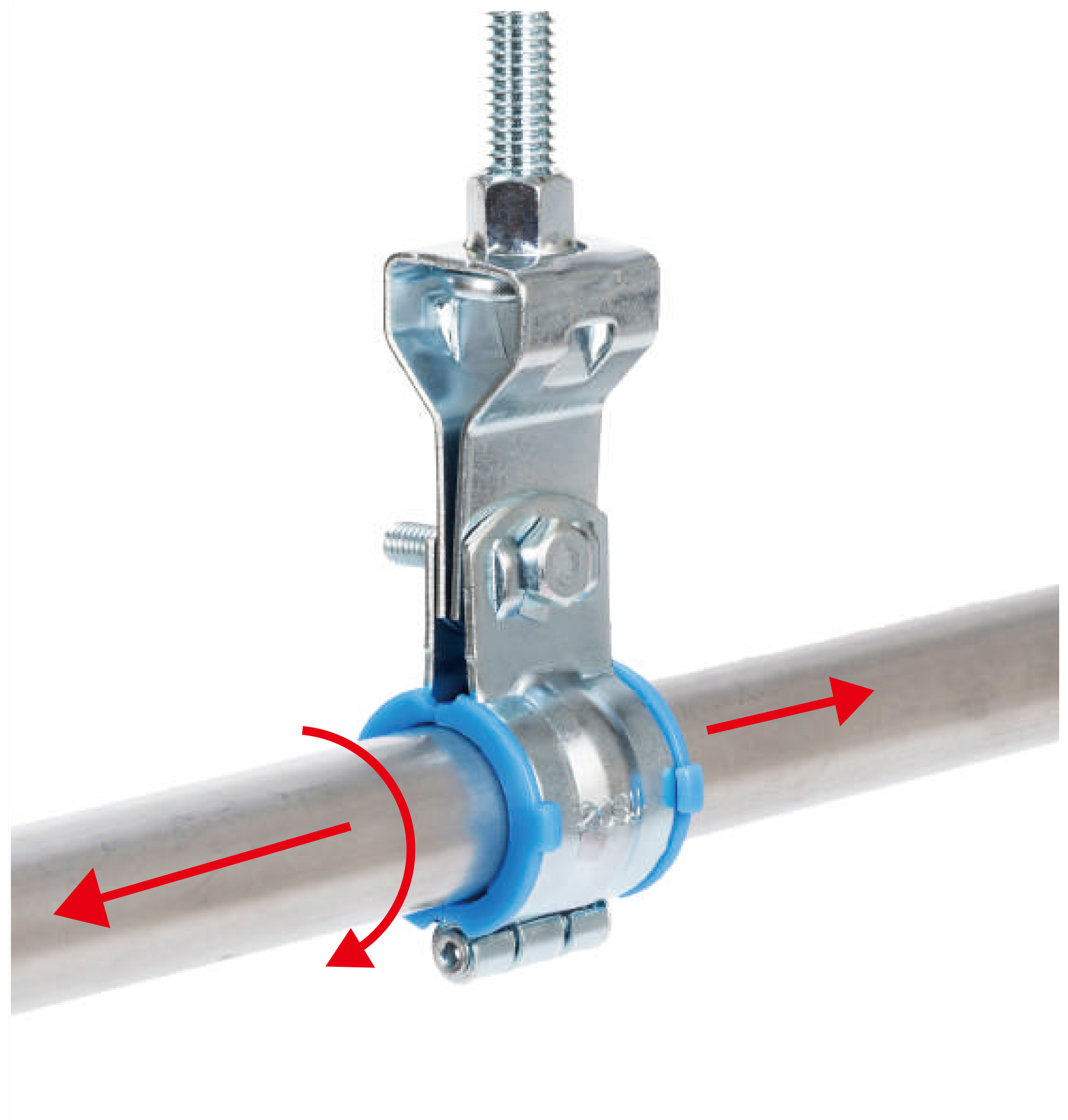 | 蝶番式でバンドの開閉が容易で施工がしやすい | 配管吊り込み時にパイプの挿入や調整が楽 | |